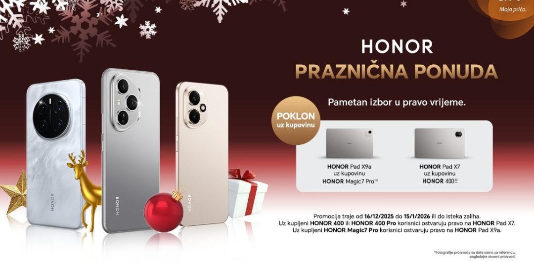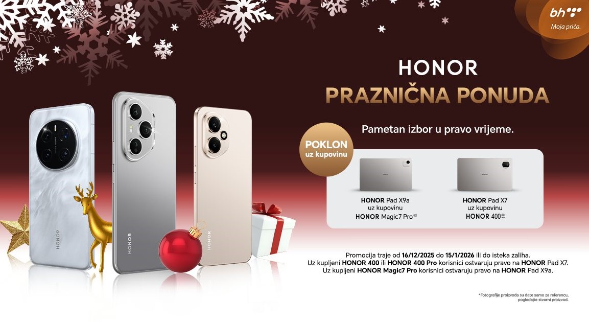 Ovaj praznični period donosi više razloga za radost! Odaberi svoj omiljeni HONOR model i preuzmi tablet potpuno besplatno! Ako izabereš: HONOR Magic7 Pro- na poklon dobijaš tablet HONOR Pad X9a! HONOR 400 ili HONOR 400 Pro- čeka te tablet HONOR Pad X7! Sve što treba da uradiš jeste da nakon kupovine izvršiš registraciju na web stranici www.honorregistracijapoklona.ba i poklon stiže po principu najbrže ispravne prijave. Požuri, zalihe poklona su ograničene! Posjeti BH Telecom poslovnice ili webshop: https://promo.bhtelecom.ba/Honor_pokloni i iskoristi ovu ekskluzivnu zimsku ponudu do 15. januara 2026.