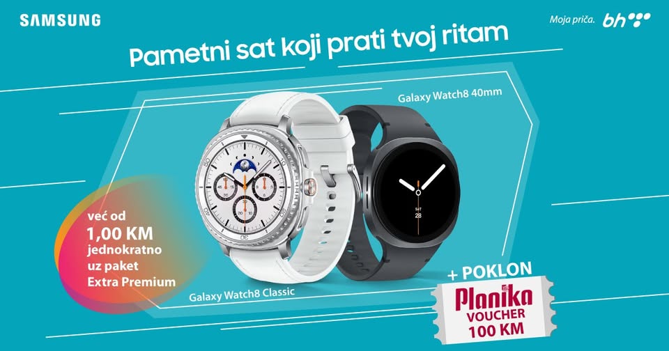 Vrijeme za pametnu odluku! Samsung Galaxy Watch8 donosi tehnologiju koja prati tvoj tempo – svaki dan. A uz kupovinu Samsung Galaxy Watch8, dobijaš Planika poklon vaučer – jer dobar stil ide uz dobar sat. + = dobitna kombinacija Pametne funkcije Moderan dizajn Poklon koji se pamti Klikni na link i iskoristi ovu super ponudu! https://promo.bhtelecom.ba/samsunggalaxywatch8